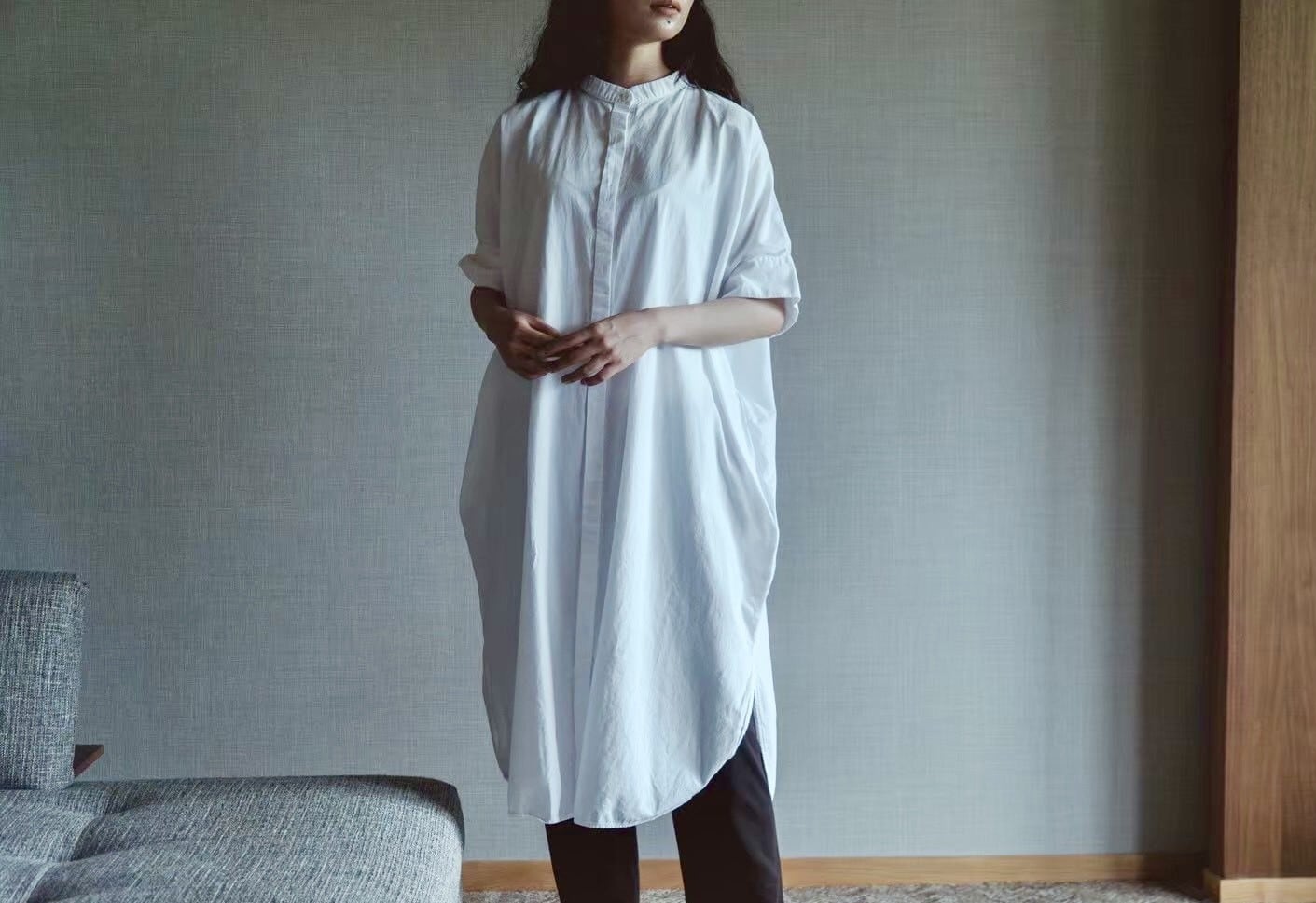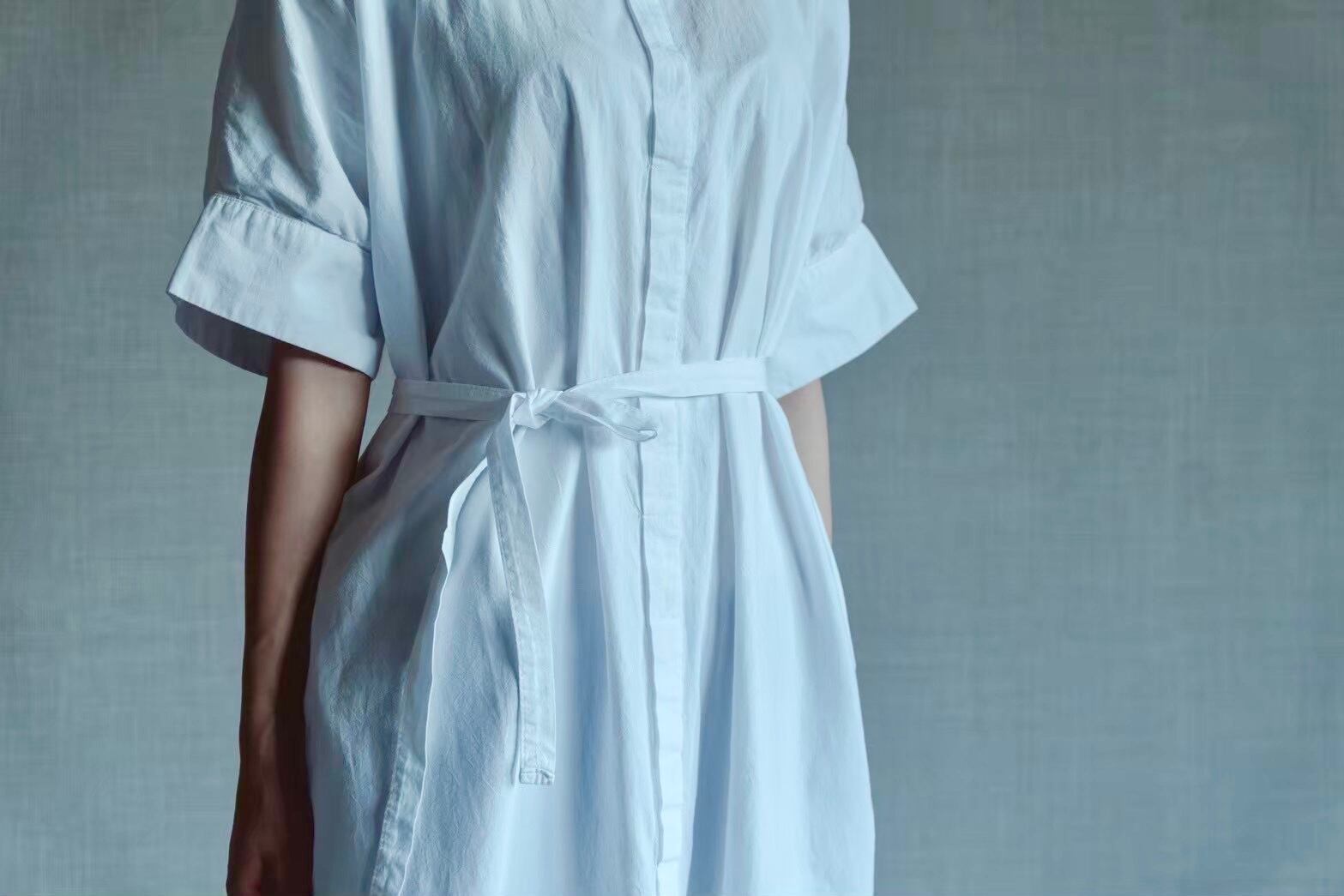 優しい丸みのあるシルエットを表現したふわりと揺れる美しいデザインでボトムスとのコーディネートもバランスよく決まります。別添えの紐を腰部分につければ、違った雰囲気でのワンピースに。前ボタンをオープンして重ね着しても素敵なワンピースです。
