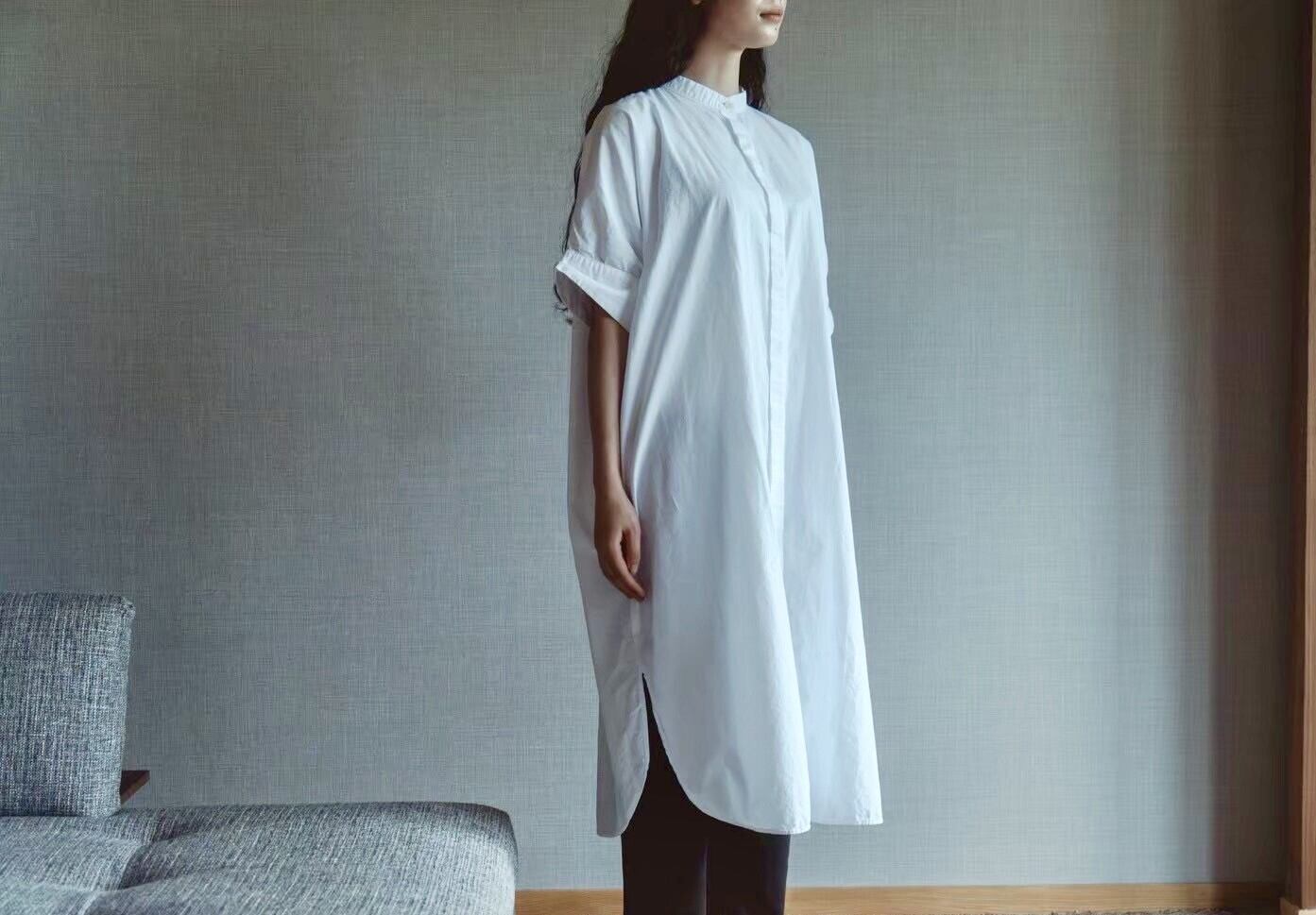 女性用の白ワンピースシャツとコットンパンツのセット。快適な着心地と洗練されたデザインが特徴。